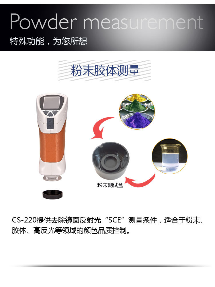 CS-220提供去除鏡面反射光“SCE”測量條件,適合于粉末、膠體、高反光等顏色品質控制。