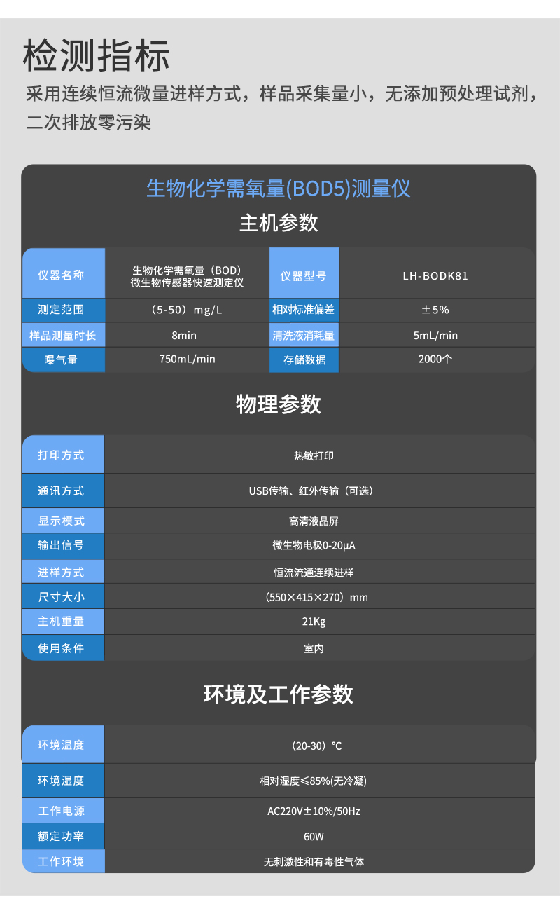 測定范圍:(5-50)mg/L(BOD濃度高于50mg/L的水樣需稀釋后檢測)